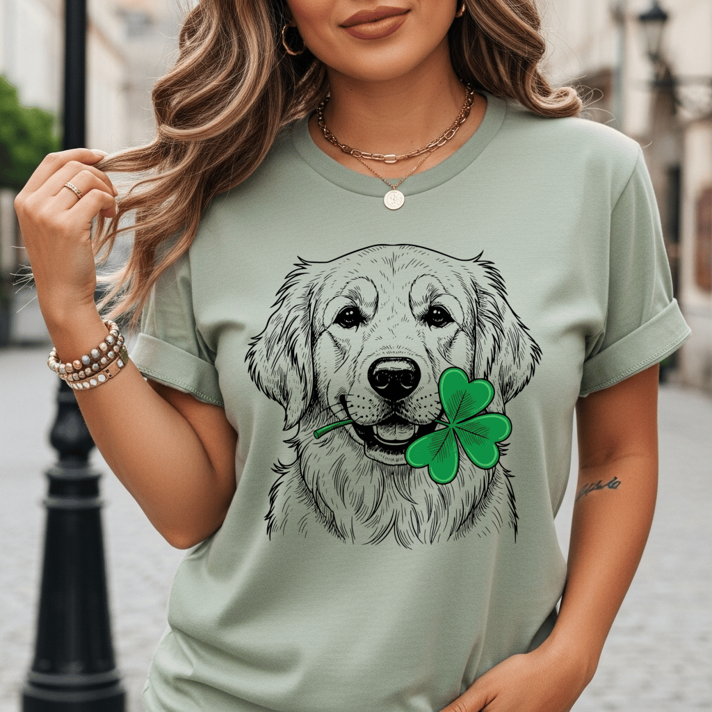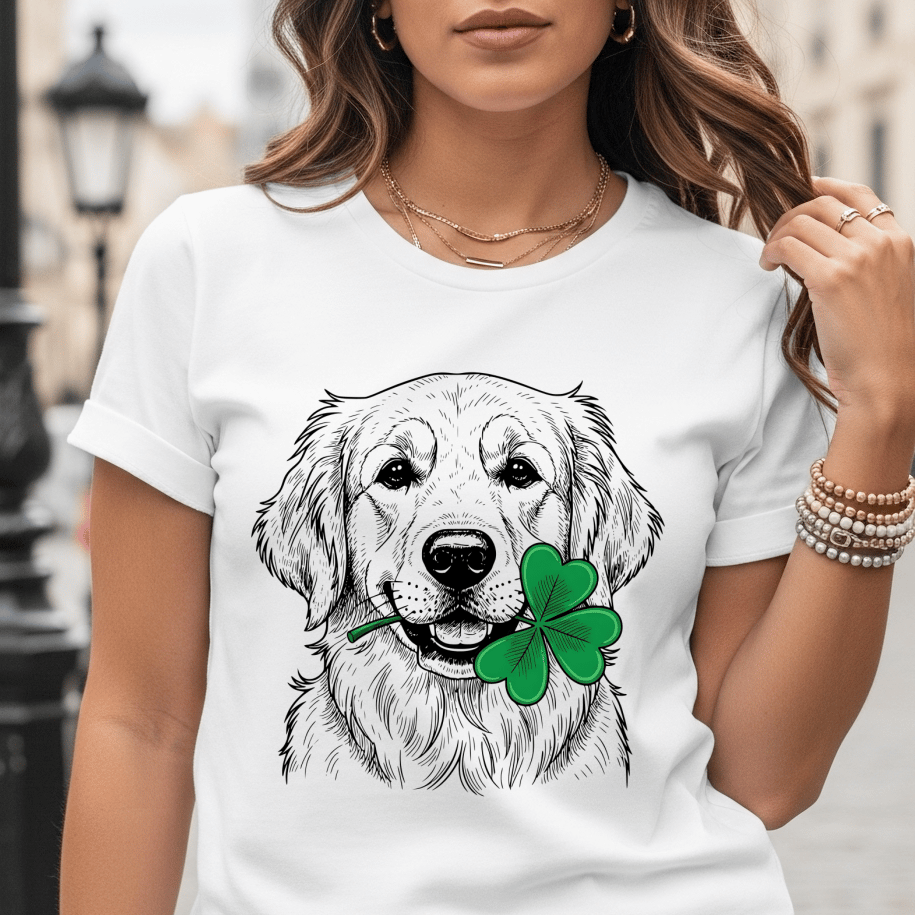 golden retriever st patricks day shirt, cute dog shamrock t shirt, irish dog lover gift tee, gildan 64000 softstyle shirt, st paddy day family matching, lucky golden retriever tee, shamrock dog graphic shirt, modern classic fit t shirt, irish celebration outfit, golden retriever lover gift, unisex softstyle graphic tee, dog mom st patricks day shirt, festive irish puppy top, family saint patricks day tees, comfortable everyday graphic shirt