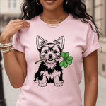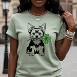 yorkshire terrier shirt, yorkie st patricks day, irish dog t shirt, shamrock dog graphic, cute yorkie tee, st paddy day outfit, irish celebration shirt, dog lover gift idea, yorkie mom shirt, lucky shamrock tee, saint patricks day dog, gildan classic fit shirt, festive irish apparel, small dog breed shirt, st patricks day outfit