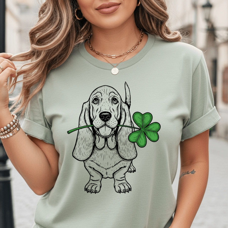 shamrock in its mouth — because even dogs know how to get lucky! Designed for dog moms, dog dads, and Basset